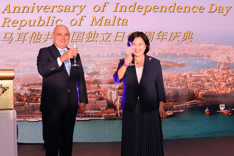(中外新闻社 中外新闻网记者 胡树萌 刘登臣)9月24日, 应马耳他驻华大使白瀚轩阁下邀请, 中外新闻社韦燕总裁同多国大使在北京王府半岛酒店宴会厅出席马耳他独立61周年国庆招待会。中国外交部副部长华春莹受邀到场, 与马耳他驻华大使白瀚轩阁下(H.E. Mr. John Busuttil)共同举杯, 祝贺马耳他独立61周年生日快乐, 祝贺中马友谊世代友好。